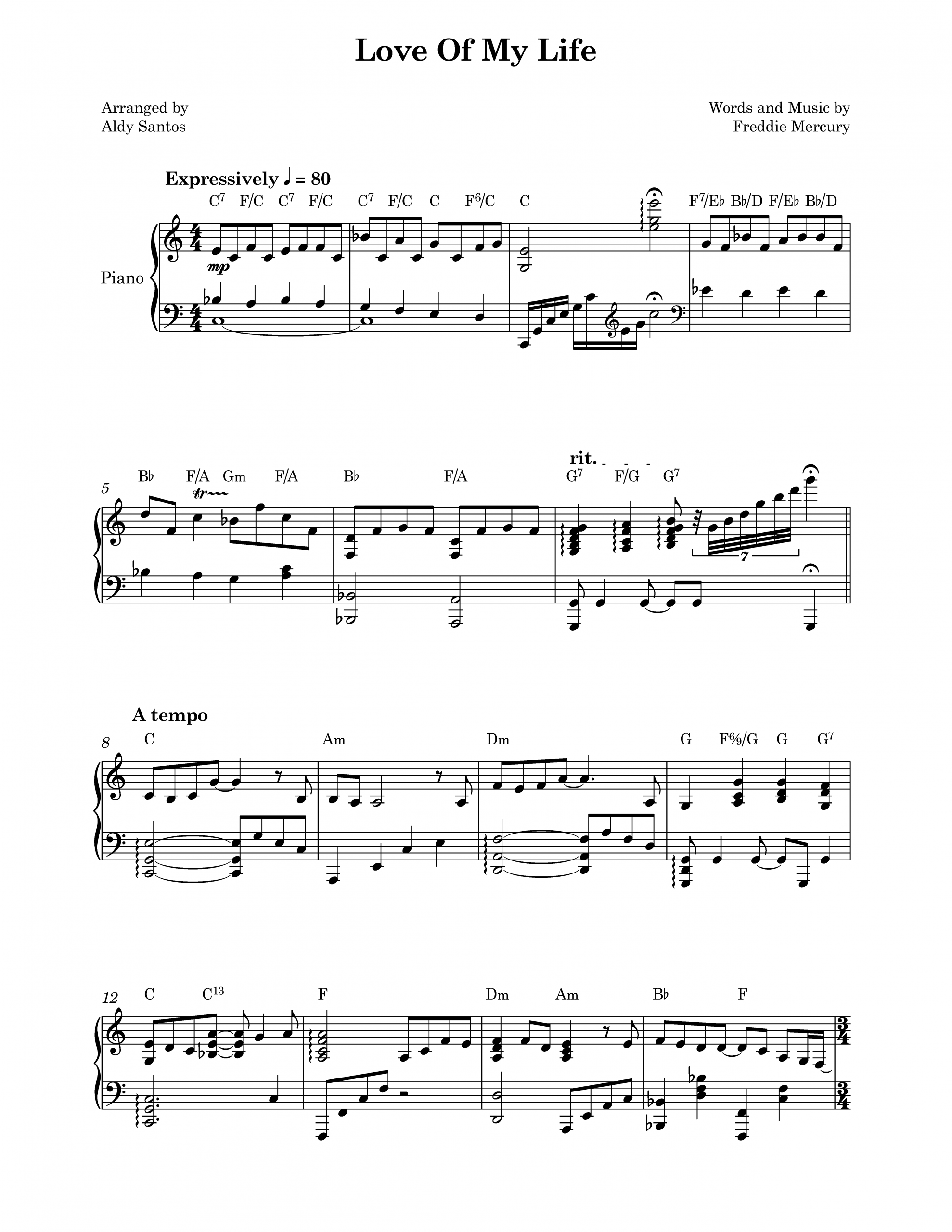 “Love of My Life – Queen (Piano Solo)” is an advanced-level piano solo arrangement, transcribed and arranged by Aldy Santos. This sheet music captures the heartfelt and melodic essence of Queen’s classic song “Love of My Life,” providing a richly detailed and expressive piece for advanced pianists. Ideal for those looking to perform a deeply emotional and iconic love ballad. Perfect for practice, recitals, and special performances.